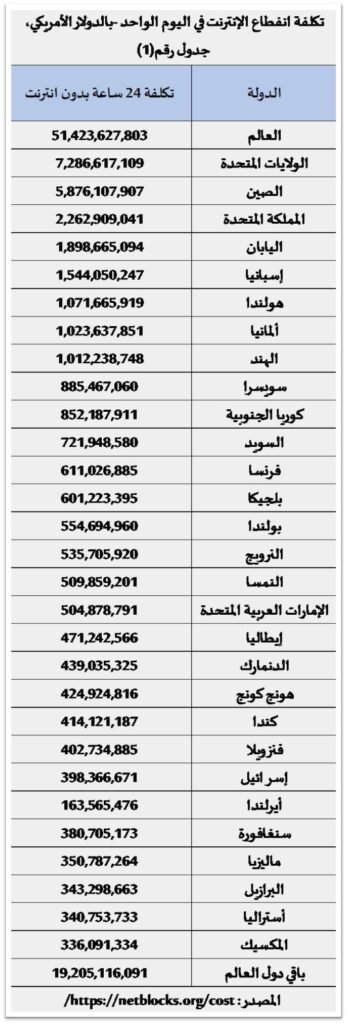 بخلاف الدول الثمانية المذكورة، هناك 21 دولة رصدت منصة “netblocks” حجم خسارتها اليومية ولكنها كانت أقل من مليار دولار عن كل يوم ينقطع فيه الانترنت، ومن بين قائمة تلك الدول جاءت دولة عربية وحيدة وهي الإمارات العربية المتحدة والذي يتوقع أن تخسر أكثر من 500 مليون دولار عن انقطاع الإنترنت كل يوم. كما هو موضح بالجدول رقم(1)