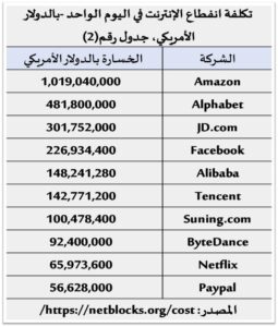 تُظهر البيانات مدى تأثر الشركات القائمة على التكنولوجيا بانقطاع الإنترنت سواء المتعلقة بالبرمجيات أو وسائل التواصل الاجتماعي أو التجارة الإلكترونية أو بالأمن السيبراني، وذلك لكونها تعتمد بشكل أساسي على البنية التحتية الرقمية في جميع عملياتها، بدءًا من التصميم والتطوير وصولًا إلى التسويق والمبيعات والخدمة للعملاء، وغيرها. وتشير البيانات بأن شركة أمازون- Amazon يتوقع أن تخسر ما يزيد على 1,019 مليار دولار كل 24 ساعة، وتعتمد أمازون بشكل أساسي على الإنترنت في جميع عملياتها، من التسويق إلى البيع والتسليم، وحتى الخدمات السحابية التي تقدمها لشركات أخرى، فأي انقطاع في الإنترنت يعني توقف شبه كامل لهذه العمليات. وما تخسره شركة امازون يمثل أكثر من ضعف ما يتوقع أن تخسره شركة ألفابت- Alphabet وهي الشركة الأم لشركة جوجل والتي من المرجح أن تخسر ما مقداره 481,8 مليون دولا يومياً، وفي الترتيب الثالث للشركات الأكثر تضررا بسبب انقطاع الإنترنت شركة دي جي دوت كوم – JD.com وهي واحدة من أكبر شركات التجارة الإلكترونية في الصين والعالم، وتشتهر بتركيزها على المنتجات عالية الجودة والخدمات اللوجستية الفعالة. تأسست الشركة في عام 1998، وقد تطورت بشكل كبير لتصبح قوة رئيسية في سوق التجارة الإلكترونية العالمية، والتي يتوقع أن تخسر أكثر من 301 مليون دولار كل 24 ساعة ينقطع فيها الإنترنت، وجاءت فيس بوك في الترتيب الرابع من حيث حجم الضرر الذي يتوقع ان تتعرض له والخسارة التي تتتحملها نتيحة قطع الإنترنت لمدة يوم كامل متواصل والتي قدرت بأكثر من 226 مليون دولار، تراوحت حجم الخسارة للشركات الست الأخريات بين 148 مليون دولار بالنسبة لشركة علي بابا- Alibaba، و56,6 مليون دولار بالنسبة لشركة -Paypal المعنية بالدفع الإلكتروني. كما هو موضح الجدول رقم(2).
