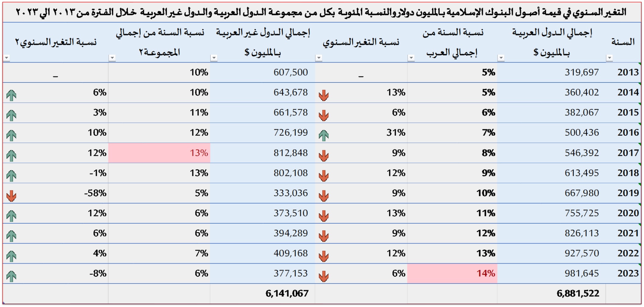 حققت الدول العربية ما يقدر بـ 6 تريليون 881 مليار دولار، أي 53% من إجمالي أصول الفترة. وتدرجت حصصها من الإجمالي حتى وصلت قمتها عام 2023 بنسبة 14%، لكنها شهدت معدلات نمو سنوي متأرجحة، أعلاها عام 2016 بنسبة 31%، وأخرها 6% عام 2023.