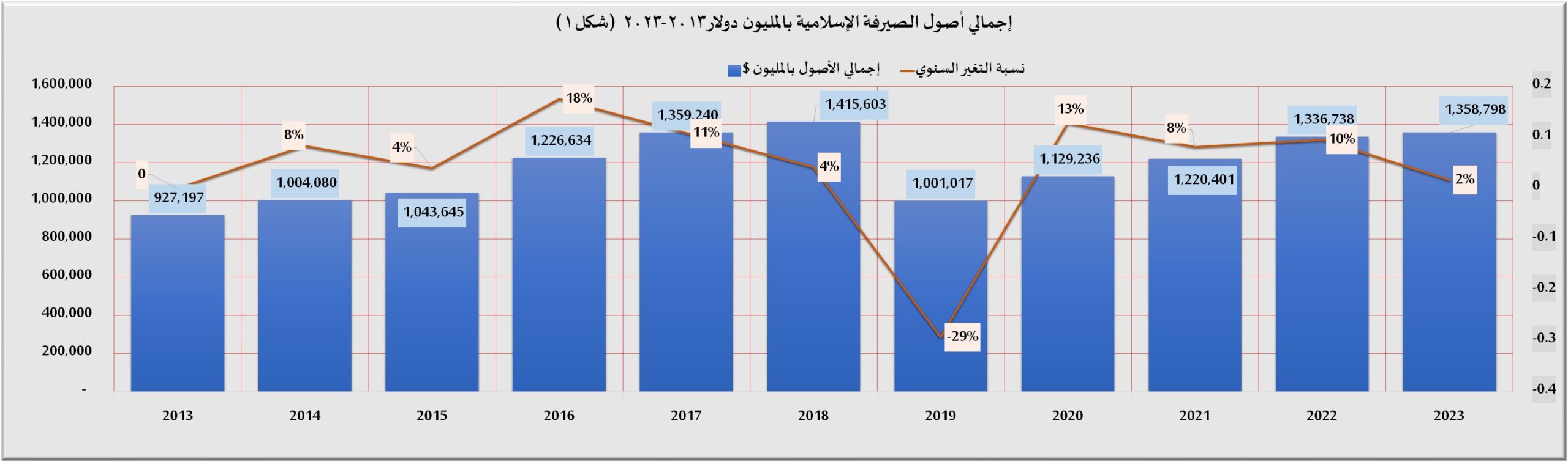 طبقا للبيانات المتاحة بقاعدة بيانات “سيسرك” و”منظمة التعاون الإسلامي “OIC ، فإن إجمالي أصول البنوك الإسلامية حققت خلال الفترة من 2013 الي 2023 نموا سنويا قدره 3.9% ، ونمواً تراكمياً إجماليا قارب 47% خلال الفترة بأكملها، فيما بلغت القيمة الإجمالية للأصول نحو 13.022 تريليون دولار امريكي، تركز ما يناهز الـ 53% منها داخل البلدان العربية، و17% منها بالسعودية، في حين تباطأت معدلات النمو السنوي للدول غير العربية والتي بلغ نصيب أصولها 47% من الإجمالي (6.1 تريليون دولار أمريكي).