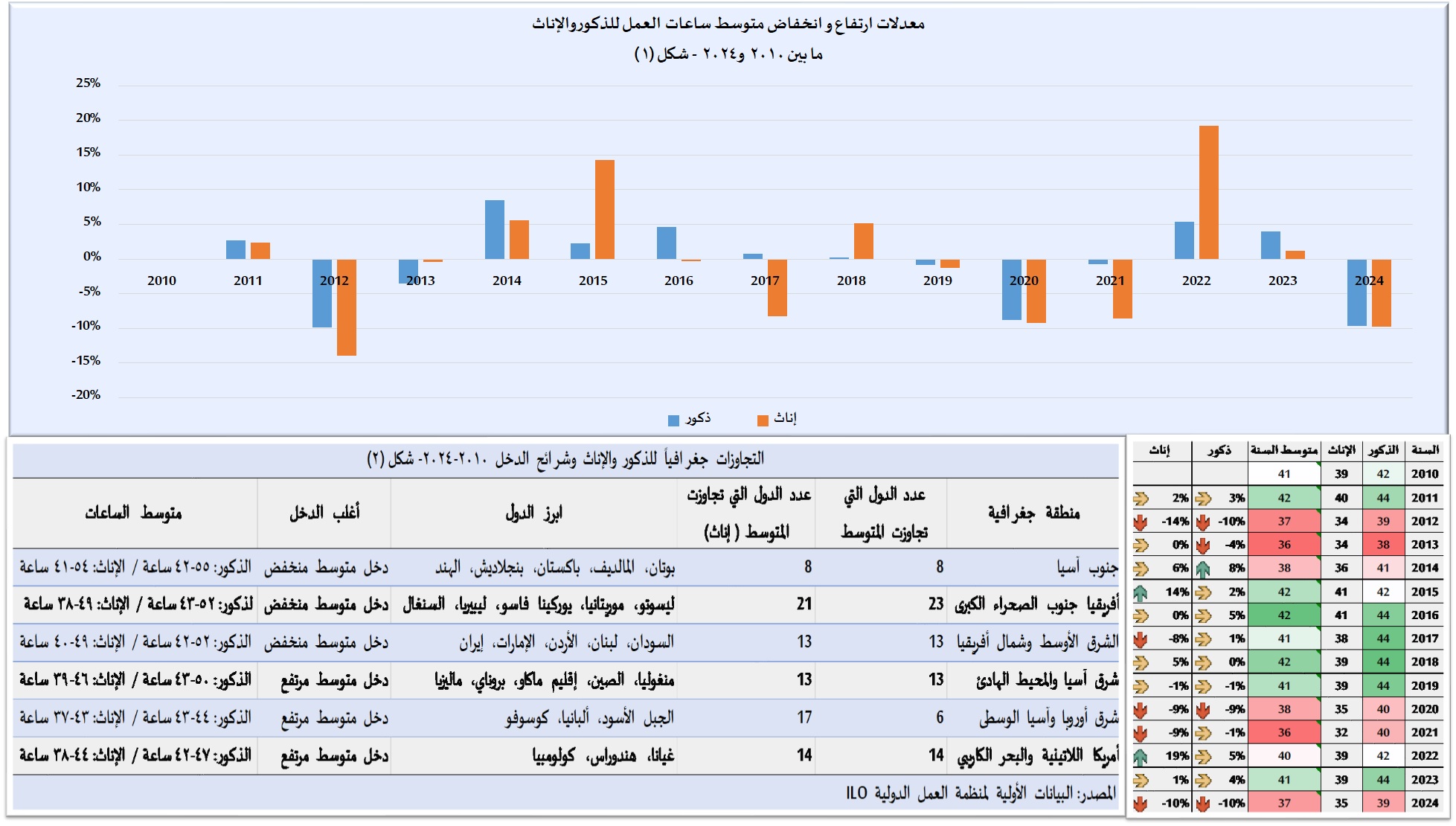والخلاصة، أن الفجوة بين المعايير الدولية والواقع العملي ما زالت قائمة، فبينما حافظ العالم على متوسط قريب من المعيار (41 ساعة للذكور و37 للإناث)، لا تزال مناطق مثل جنوب آسيا وأفريقيا جنوب الصحراء – تعمل بما يفوق الحد الأقصى الموصي به.