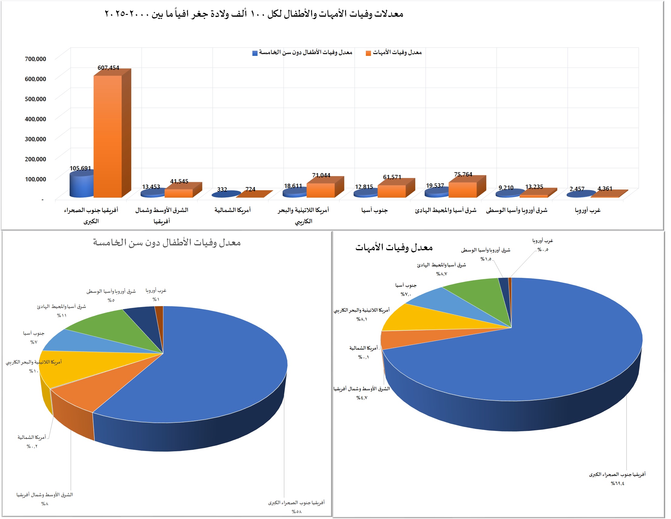 كما تشير الى تركزًا جغرافيًا شديدًا وغير متكافئ، حيث تتصدر أفريقيا جنوب الصحراء الكبرى كلا المؤشرين بفارق واسع عن بقية الأقاليم. إذ تستحوذ وحدها على نحو 58% من مجموع قيم وفيات الأطفال دون الخامسة عالميًا، وترتفع حصتها إلى نحو 69% من مجموع قيم وفيات الأمهات، بما يعكس عمق الهشاشة الصحية في الإقليم، خاصة فيما يتعلق بمخاطر الحمل والولادة.