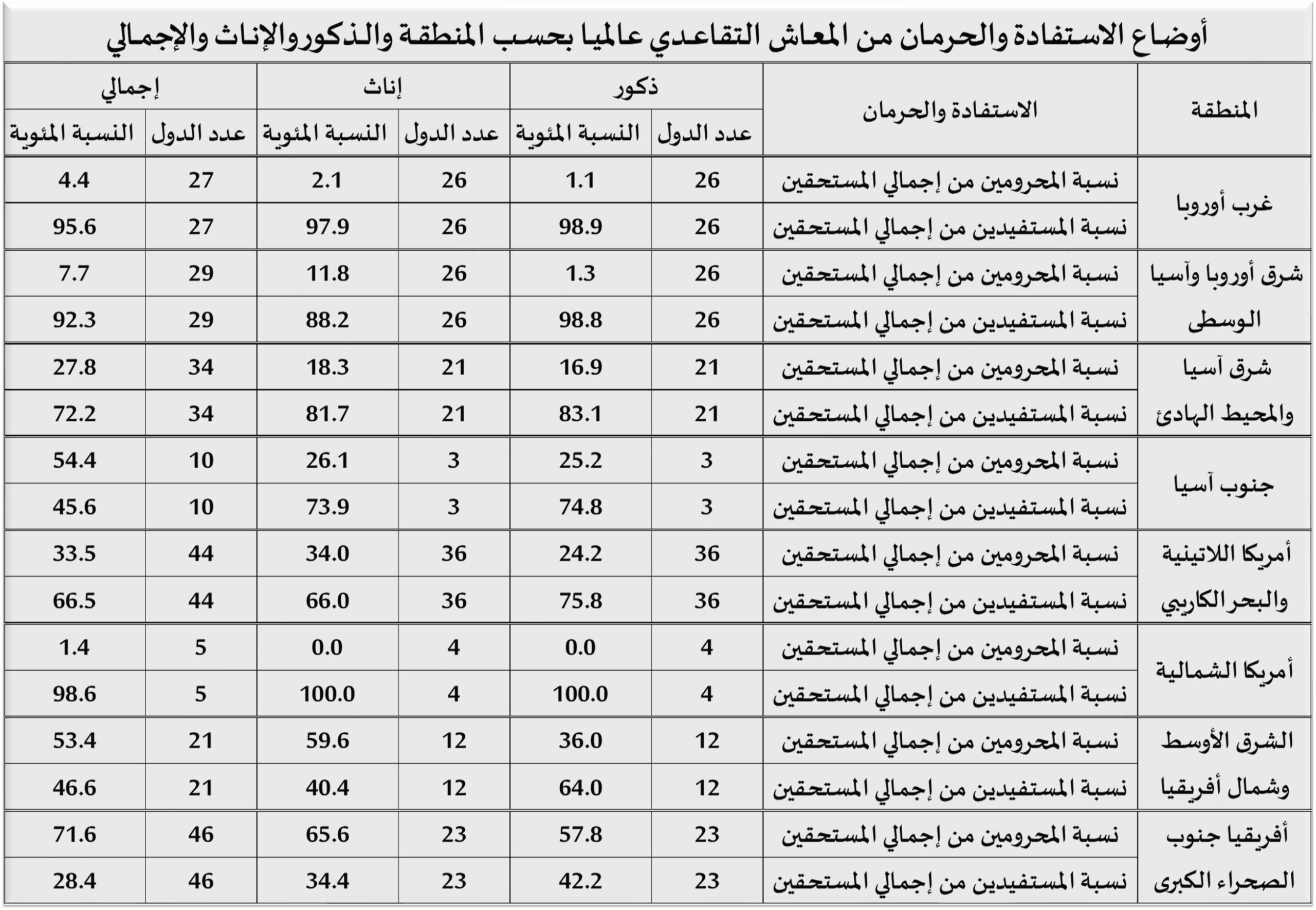 وفي مناطق القمة بدول “غرب أوروبا” و”أمريكا الشمالية”، تتطابق تقريبًا أعداد الدول ونسب الحرمان (0%) للذكور والإناث في المرتبة 1، وهذا يشير إلى أن أنظمة الحماية الاجتماعية المتقدمة تنجح في تحييد العامل عامل النوع (ذكور ـ إناث) في قضية الاستفادة من المعاش التقاعدي.