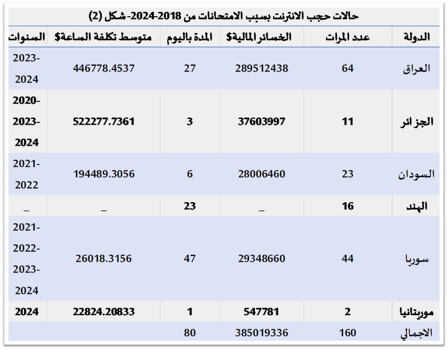 أما السبب الثاني فإنه يتكرر فقط مع مواسم الامتحانات المدرسية الثانوية والإعدادية وخاصةً الثانوية العامة لمنع/ أو الحد من الانتهاكات التي قد تحدث في اللجان ومنع الغش وتسرب أسئلة الامتحانات، بلغ إجمالي 160 حالة من إجمالي فترة الرصد. وقد لجأت خمس دول عربية الى هذا الإجراء وهي العراق واحتلت 40% من إجمالى الحالات بعدد 64 حالة آخر سنتين فقط، خسرت خلالها ما يقرب من 290 مليون دولار، بمعدل 2.3 مليون دولار خسارة في الساعة الواحدة عام 2024 و1.2 مليون دولار عام 2023، تراوحت فترات الانقطاع بها بين ساعتين واربع ساعات وأطول فترة كانت 7 أيام في فبراير 2023. وكانت حصة سوريا 28% من إجمالي الحالات، بعدد 44 حالة خلال آخر 4 سنوات تراوحت ما بين ساعتين الى يوم، ما عدا 22 يوم عام 2021، وسجلت خسائرها الإجمالية 29.3 مليون دولار. جاءت بعدها السودان بنسبة 14% من إجمالي الحالات- أى 23 حالة خلال 2021 و2022 في فترات تراوحت ما بين ساعتين و3 ساعات،خسرت ما قدره 28 مليون دولار. وبالرغم من أن نسبة الجزائر 7% من إجمالي القائمة بعدد 11 حالة فقطإلا انها خسرت في الساعة ما بين 807 الف الى 1.7 مليون عام 2024، و901 الف في الساعة سنة 2023، والملفت أن حالة الانقطاع الوحيد لها في سبتمبر 2020 خسرت فيها 4 مليون في الساعة. ويبدو أن موريتانيا لم تنتهج هذا الإجراء إلا في يومين خلال اغسطس الحالى لمدة اربع و 11 ساعة. والوحيدة من دول العالم التي تلجأ لهذا القرار هي الهند و نسبتها10% من إجمالي الحالات بعدد 16 حالة، غير أن خسائرها غير مُعلنة.