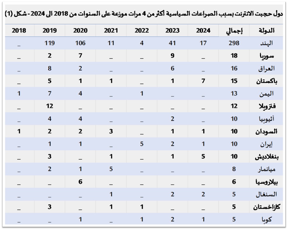 اعتمد تحليل مركز “جسور” لوقائع القطع المتعمد على البيانات الأولية لموقع pulse. Internet society.org – التي تغطي الفترة بين 28 مارس 2018 و19 أغسطس 2024، والتي شملت 57 دولة و677 حالة حجب لخدمات الانترنت لفترات كان أقصرها ساعة واحدة وأطولها 1383 يوماً، وتبين من التحليل أن عمليات إغلاق الإنترنت المُتعمَدة قد تستمر لبضع ساعات في بعض الدول أو لأشهر عديدة في دول أخرى حتي ينتفي السبب. وقد تنطوي بعض عمليات الإغلاق على حجب جزئي لخدمات معينة مثل وسائل التواصل الاجتماعي، أو تقييد الاتصال بالانترنت عبر الهاتف المحمول، بينما قد تُفرض عمليات إغلاق كلي للإنترنت في منطقة جغرافية محددة. لكن الأهم هو الخسائر المالية التي تتكبدها الشعوب نتيجة حجب الإنترنت، وهى تعدت في فترة الرصد 11.4 مليار دولار خلال السبع سنوات، وسجلت الهند على مستوى العالم 313 حالة بواقع نصف الحالات تقريباً بالفترة، وهي الأولى من حيث أكثر حالات تعليق لخدمات الانترنت في بعض الأقاليم مثل البنغال، وجامو وكشمير بسبب الصراعات السياسية، والأكثر تكلفة للساعة الواحدة وقدرت بحوالي 4 مليون دولار ، تليها العراق 90 حالة، ثم سوريا والسودان (62 و33 حالة على التوالي)، بينما تكبدت روسيا خسائر قدرها 4.8 مليار دولار منذ حربها مع أوكرانيا في 26/2/2022 وحتى تاريخه جراء حجب مواقع التواصل الاجتماعي مثل تويتر وفيسبوك و إنستجرام، ومواقع وسائل الإعلام الإخبارية الأجنبية الذي تعدى 900 يوما، بيد أن هذا الرقم غير دقيق حيث أن نصف الحالات تقريباً لم يُرصد لها خسائر مالية، وخاصة حالات الإغلاق بالهند، أى ان هذه الخسائر غالياً ما تُناهز الضعف.