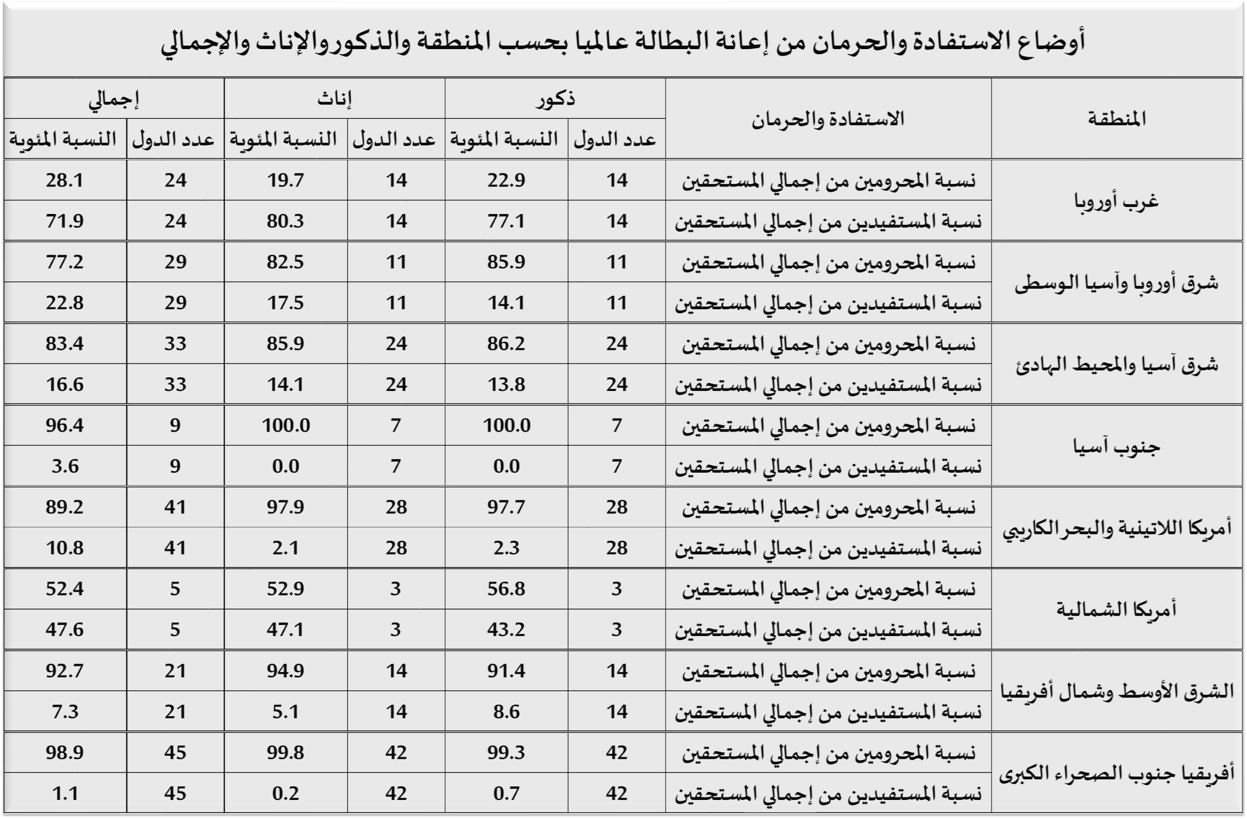 وفي الشرق الأوسط وشمال أفريقيا، تتأكد مظاهر القصور والتراجع في منح إعانات البطالة، فقد أظهرت البيانات أن نسبة المحرومين من إعانات البطالة تراوحت بين 87% و97%، وبلغت 100% في ثماني دول. في المقابل، لم تتجاوز نسبة المستفيدين 3–13%. ويكشف هذا الواقع عن اعتماد نماذج حماية اجتماعية تقليدية تركز على الدعم السلعي أو التوظيف العام، مع إهمال آليات التعويض عن فقدان العمل، رغم ارتفاع معدلات البطالة.