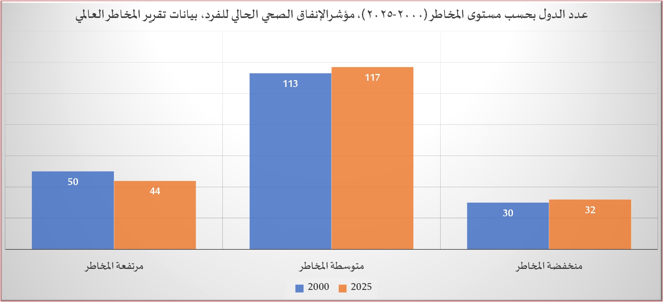 وتشير البيانات إلى تراجع عدد الدول المصنفة ضمن فئة المخاطر المرتفعة من 50 دولة عام 2000 إلى 44 دولة عام 2025، وهو ما يشير إلى تحسن نسبي في مستويات الإنفاق الصحي لدى بعض الدول، وإن كان هذا التحسن محدود النطاق، وفي المقابل، ارتفع عدد الدول الواقعة ضمن فئة المخاطر المتوسطة من 113 دولة إلى 117 دولة، بما يدل على انتقال عدد من الدول من وضع المخاطر المرتفعة إلى المتوسطة دون أن تتمكن من بلوغ مستوى الأمان الصحي المنخفض المخاطر، كما يُسجَّل ارتفاع طفيف في عدد الدول منخفضة المخاطر من 30 إلى 32 دولة، وهو ما يعكس بطء توسع هذه الفئة رغم مرور خمسة وعشرين عامًا.