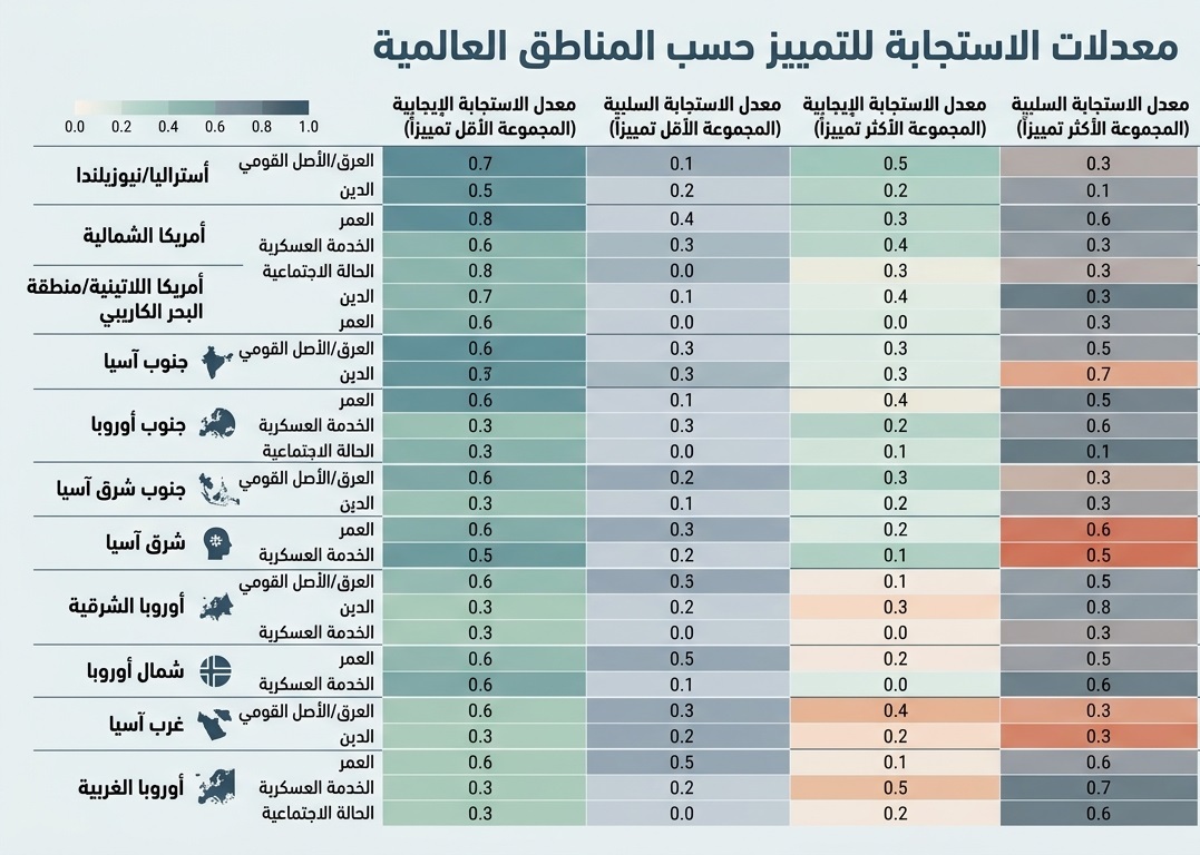 أما السِمة الخامسة والأخيرة، هي سِمة الخدمة العسكرية أو الانتماء، وهي ترتبط بالمشاركة في مؤسسات الدولة، وقد تؤثر في بعض الحالات في مستوى القبول الاجتماعي أو التقدير المهني، وتُظهر البيانات أن هذه السمة سجلت أدنى مستويات الفجوة مقارنة ببقية السمات، ففي أمريكا الشمالية وغرب أوروبا تساوت قيم الاستجابة الإيجابية بين الفئات الأقل والأكثر تعرضًا للتمييز، حيث بلغت 0.1 مقابل 0.1 في الأولى، و0.2 مقابل 0.2 في الثانية، وهو ما يدل على غياب فجوة تمييزية واضحة في هذا البعد.