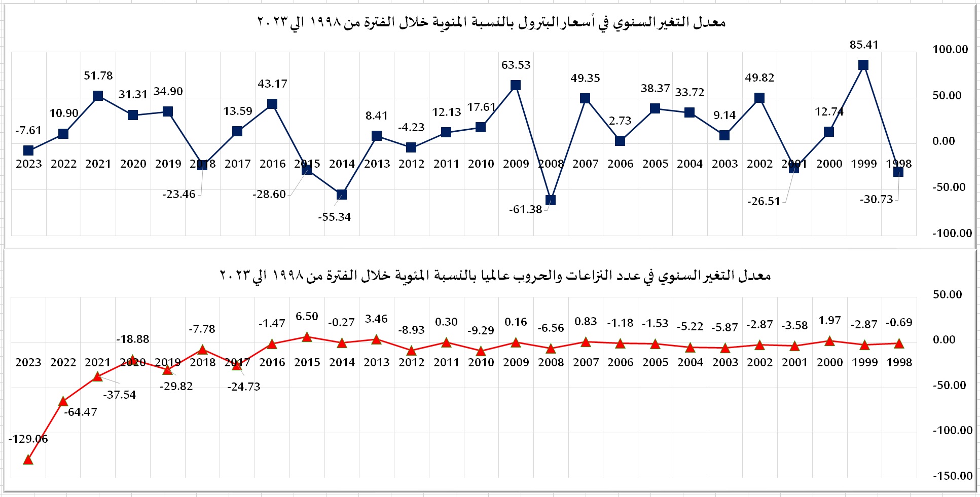 النظرة التحليلية إلى معدل التغير على الجانبين (أعداد حروب ونزاعات ــ أسعار بترول) تشير إلى تفكك الارتباط بين عدد النزاعات والأسعار. فعلى سبيل المثال في عام 2015، سجلت النزاعات أعلى زيادة (6.50) بينما كانت الأسعار في انهيار (-28.60). وفي 2017-2023، سجلت النزاعات انخفاضات حادة متتالية (وصلت إلى -129.06 عام 2023) بينما كانت الأسعار تتقلب بعنف (ارتفعت 51.78 عام 2021، و10.90 عام 2022، ثم انخفضت 7.61 عام 2023)، ويلاحظ أيضا أن قمم الأسعار في هذه الفترة جاءت نتيجة عوامل متعددة: تعاون أوبك (1999)، المضاربة (2002-2008)، الاضطرابات الجيوسياسية في ليبيا (2011) والسعودية (2019)، والحرب الروسية الأوكرانية (2022). بينما قيعان الأسعار جاءت نتيجة أزمات مالية (2001، 2008) وثورة النفط الصخري (2014-2015) وجائحة كورونا (2020).