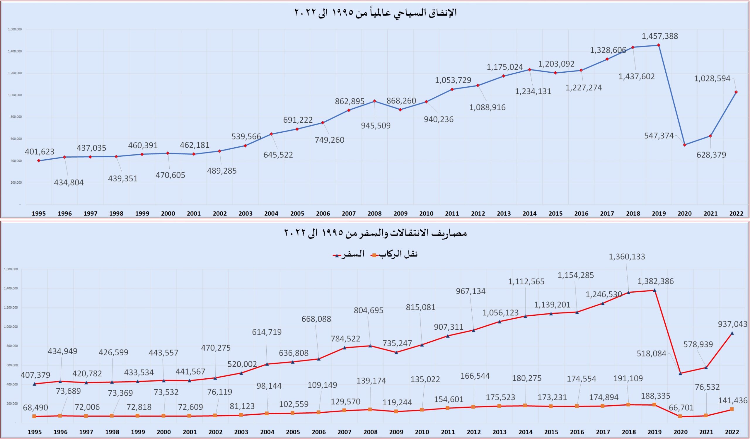 خلال الـ 28 عاما الماضية، أنفق السائحون حول العالم ما يزيد قليلا علي 23 تريليون دولار، كان من بينها 21.3 تريليونا بنسبة 87% انفقت على السلع والخدمات، و 3.4 تريليونا بنسبة 13% انفقت على الانتقال الى مقاصدهم السياحية والعودة منها، وطبقا لقاعدة بيانات منظمة السياحة العالمية التابعة للأمم المتحدة فإن إنفاق هذه الأموال تم وفق نمط تصاعدي خلال الفترة من 1995 حتي 2022، وبلغ ذروته عام 2019 بإجمالي حوالي 1.5 ترليون دولار، حتي أصيب العالم بشلل في جميع مجالات الحياة اليومية وعلى رأسها السياحة والتنقل بين الدول بسبب وباء كورونا، ما أدى الى هبوط حاد في الإنفاق السياحي بلغ 62% في 2020 و57% في 2021. ثم انتعشت السياحة مجدداً في 2022 وعاودت نفقات السياح في الارتفاع بنسبة 164%.