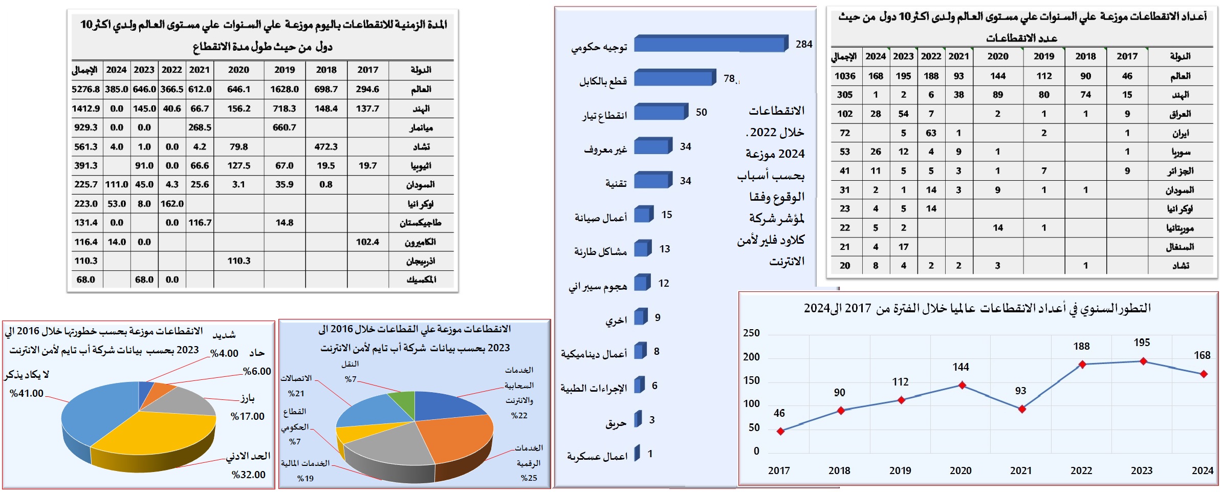 خلال السنوات الثماني الماضية 2017 ــ 2024، تعرضت شبكة الانترنت لنحو 1035 من حوادث الانقطاع، متنوعة القوة والاتساع والتوقيت والأسباب والمكان، حيث كان 4% منها شديد الخطورة، و25 % منها أصاب الخدمات الرقمية، وبلغت ذروتها في العام 2022 بواقع 188 حادثاً، وما يزيد علي نصفها وقع عمداً بسبب توجهات حكومية، ومن حيث المكان وقع 66% منها في عشرة دول فقط.