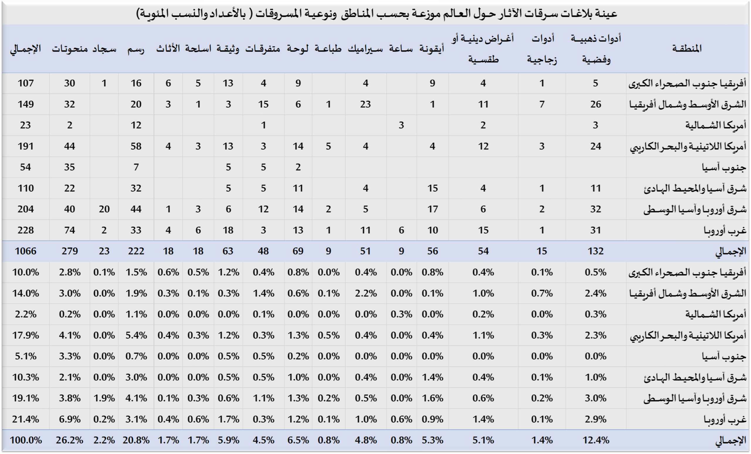 في النهاية يمكن القول أنه علي الرغم من كون الارقام السابقة خرجت من تحليل عينة صغيرة لبلاغات السرقات،فهي تعطي مؤشراً أولياً على أن قارة اوروبا بغربها وشرقها، تعد المعقل الرئيس لسرقات وتجارة الاثار عالمياً.